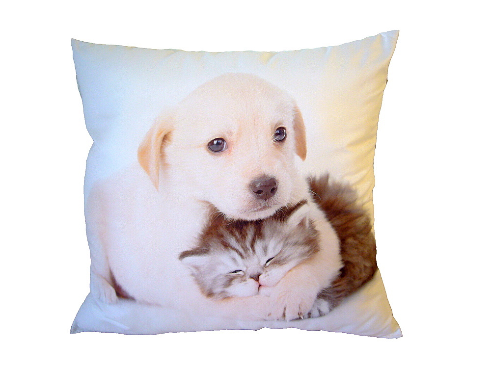 Rozměr: 40 x 40 cm. Dezén: Pes objímající kotě. Povlakový materiál: 50% bavlna, 50% Polyester. Náplň: 100% Polyester (duté vlákno ve tvaru kuliček). Polštářek je vhodný i pro alergiky, lze prát celý v pračce. Doporučená teplota praní 40°C. Kvalitní fototisk Vám umožní opakované praní bez...