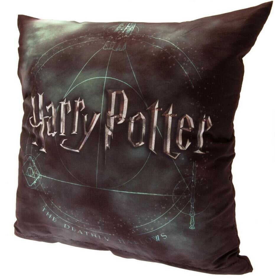 Oficiální produkt - polštář z katalogu výrobků s licencí, logem a grafikou populární knižní a filmové ságy Harry Potter. Zboží je legálně licencováno a prodáváno se souhlasem vlastníků licenčních práv.Černo-zelený polštář vyveden s grafikou siluety kouzelných předmětů relikvie smrti (Deathly...