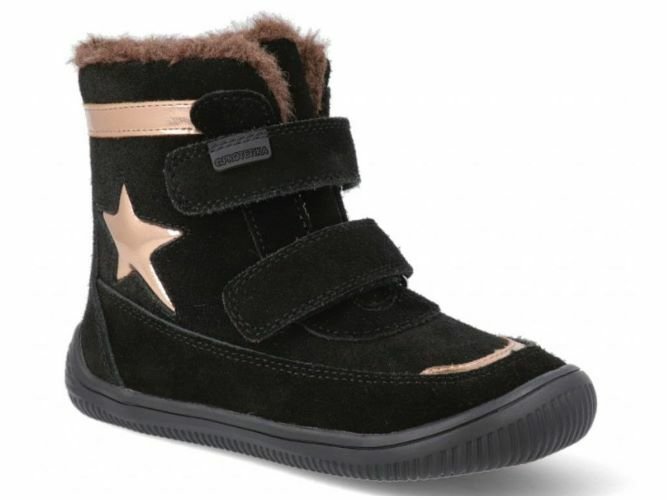 Dětská zimní barefootová vycházková obuv Linet black jsou stylové botičky z kůže a vyztuženou patou pro pohodlnější chůzi. Uvnitř je hřejivý kožíšek díky kterému bude v botičkách teplo. Botičky se zapínají na suchý zip. Mají vyvýšený okop.