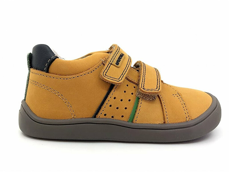 Dětská barefootová vycházková obuv Rasel beige má ohebnou gumovou podrážku v praktické šedé barvě s jemným vzorkem. Obuv je vyrobena z hladké kůže v krásné hořčicové barvě s modrými detaily. Popis:zvýšená špička - chránící obuv proti okopupevný opatek - pata pevnější s klasickým pevným...