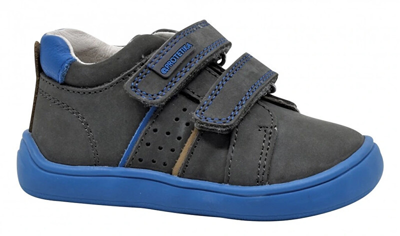 Dětská barefootová vycházková obuv Rasel grey je vyrobena z hladké kůže v šedé barvě. Na boku je modrý a krémový detail. Podrážka je ohebná, gumová s jemným vzorkem v modré barvě.Popis:zvýšená špička - chránící obuv proti okopupevný opatek - pata pevnější s klasickým pevným opatkemsvrchní...