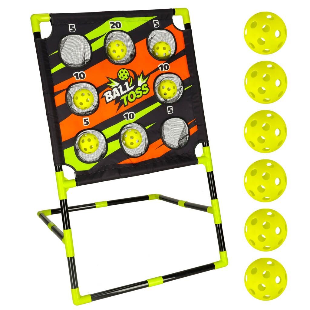 - Obsahuje hraciu dosku s cieľovými otvormi na hádzanie vrecúšok alebo loptičiek.