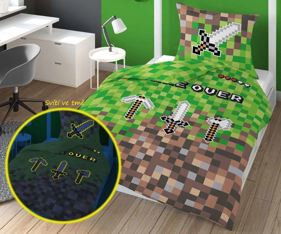 DETEXPOL Povlečení Kostičky Game Over meč svítící 140/200, 70/80Bavlněné povlečení na velkou postel, zapínání na zip, povlečení má z každé strany jiný motiv, viz. foto, povlečení svítí ve tmě po nasvícení na denním světle, svítící efekt se může začít vytrácet po 5 vypráních, možno prát na...