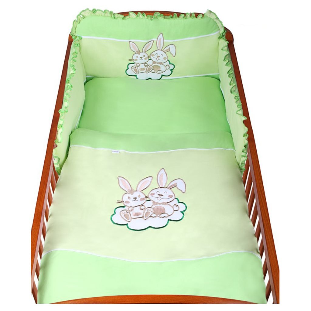 Dětská bavlněná 3-dílná souprava do postýlky New Baby Bunnies. Souprava obsahuje povlečení na polštářek, povlečení na peřinku a mantinel. Polštář je jednobarevný, peřinka má obrázek zajíčků a mantinel má volánek, obrázek zajíčků a má tkaničky na uchycení k postýlce. Složení: povlak 80% bavlna, 20% polyester, výplň 100% polyester. Rozměry: polštář cca 40x60 cm, peřinka cca 100x135 cm, mantinel: délka cca 170 cm, výška středu cca 35 cm, výška boků cca 26 cm.