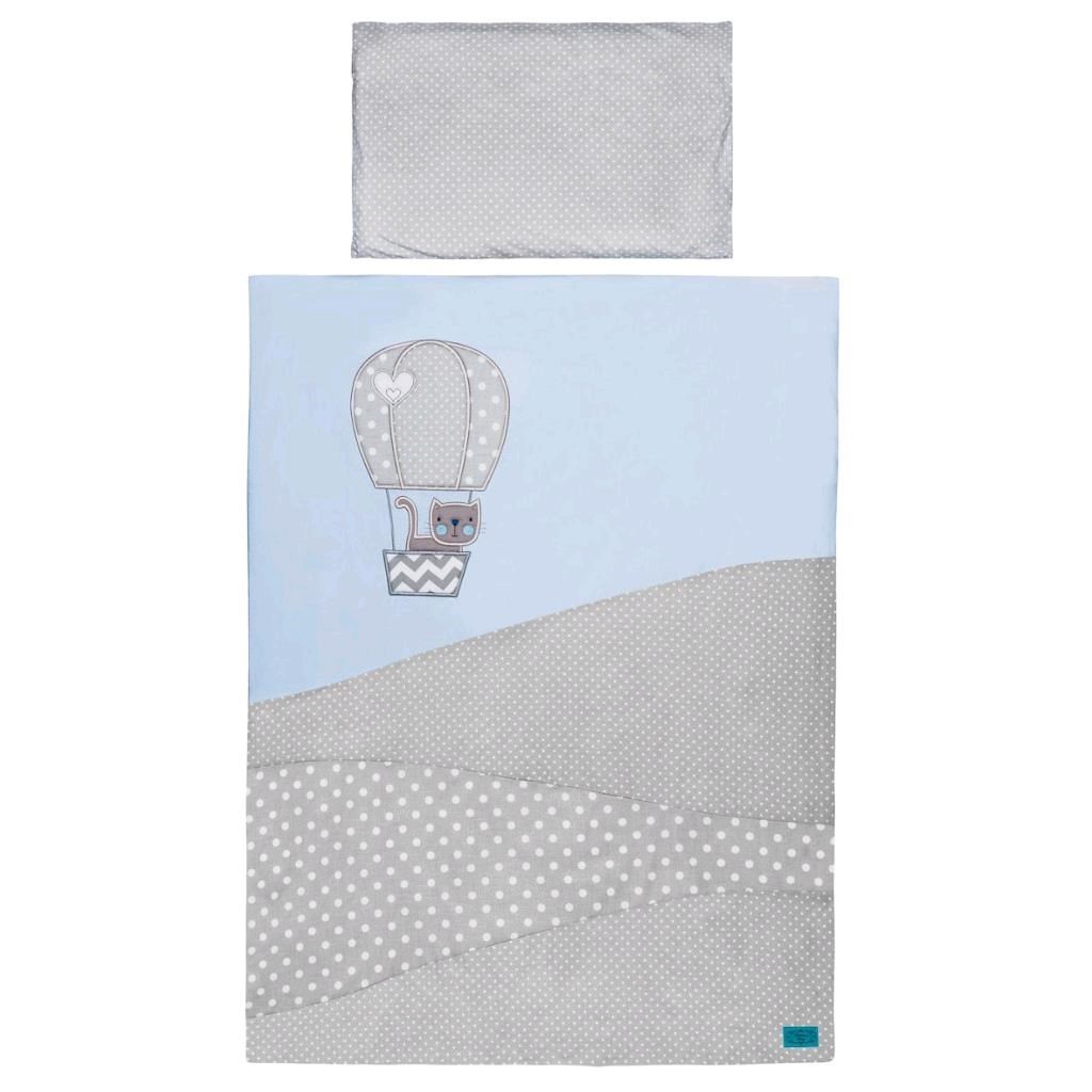Bavlněná 3-dílná souprava do postýlky Belisima Balón pro miminka. Souprava je zdobená obrázkem létajícího balónu, kočičky a puntíků. Polštář je z jedné strany puntíkovaný, druhá strana je jednobarevná. Souprava obsahuje povlečení na polštářek cca 40x60 cm, povlečení na peřinku cca 90x120 cm a mantinel cca 31x175 cm. Materiál 100% bavlna.