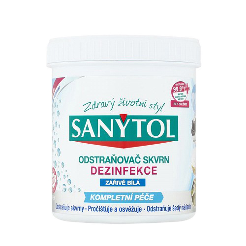 Dezinfekční odstraňovač skvrn SANYTOL zářivě bílá 450g Dezinfekční prostředek Zářivě bílá na odstraňování skvrn byl vyvinut speciálně pro odstraňování skvrn z bílého prádla. Prádlo vyprané při nízkých teplotách i nadále obsahuje mikroby. Bakterie a plísně v prádle způsobují...