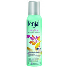 Deodorant Fenjal Vitality Deodorant Spray 24H. Deodorant Fenjal Vitality Deodorant Spray 24H poskytuje pokožce šetrnou 24 hodinovou ochranu a jemnou péči. Obsahuje olej z jader hroznů a zklidňující složky. Nezanechává bílé stopy a je šetrný k pokožce. Neobsahuje alkohol, barviva ani konzervační...