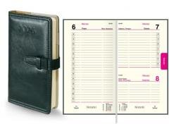 - Format 3/4 B5 (107x190x25 mm) - Ilość stron: 364 - Dostępne kolory: czarny, granatowy, bordo, zielony, brąz - Oprawa: twarda skóropodobna + gąbka - Pasek wsuwany - Perforowane rogi - Registry wycinane - Układ środka: dzień na stronie ( sobota niedziela na 1 stronie) - Wewnątrz tasiemka do...