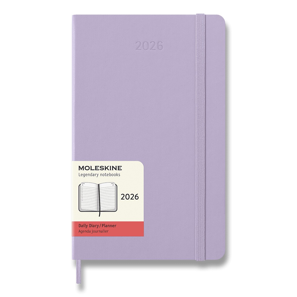 Velký klasický denní diář na rok 2026. Na každý den stránka pro poznámky a schůzky. Diář má pevnou, ve hřbetu šitou vazbu v kartonových deskách. Obepíná ho pružná páska proti samovolnému otevírání. Obsahuje praktickou vnitřní kapsu na vizitky a dokumenty, textilní záložku, 295 barevných samolepek a leták s historií značky Moleskine. Papír s gramáží 70 g/m², neobsahuje kyseliny.