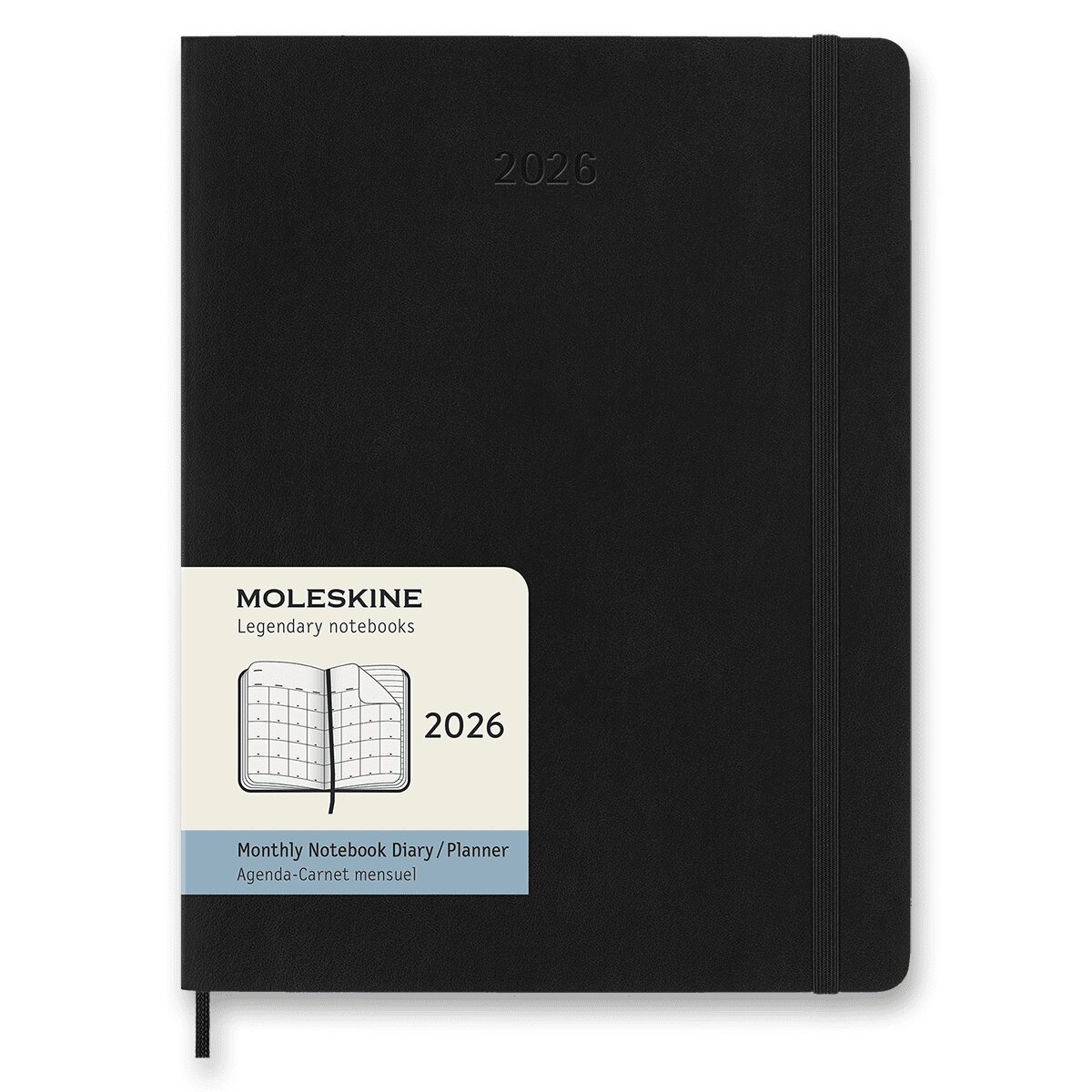 Extra velký měsíční plánovací diář na rok 2026. Měsíc je zobrazen na dvou stránkách, po kterých následují dvě linkované stránky. Na konci je 51 linkovaných stránek na poznámky. Diář má měkkou, ve hřbetu šitou vazbu. Obepíná ho pružná páska proti samovolnému otevírání. Obsahuje praktickou vnitřní kapsu, textilní záložku, 295 barevných samolepek a leták s historií značky Moleskine. Papír s gramáží 70 g/m², neobsahuje kyseliny.