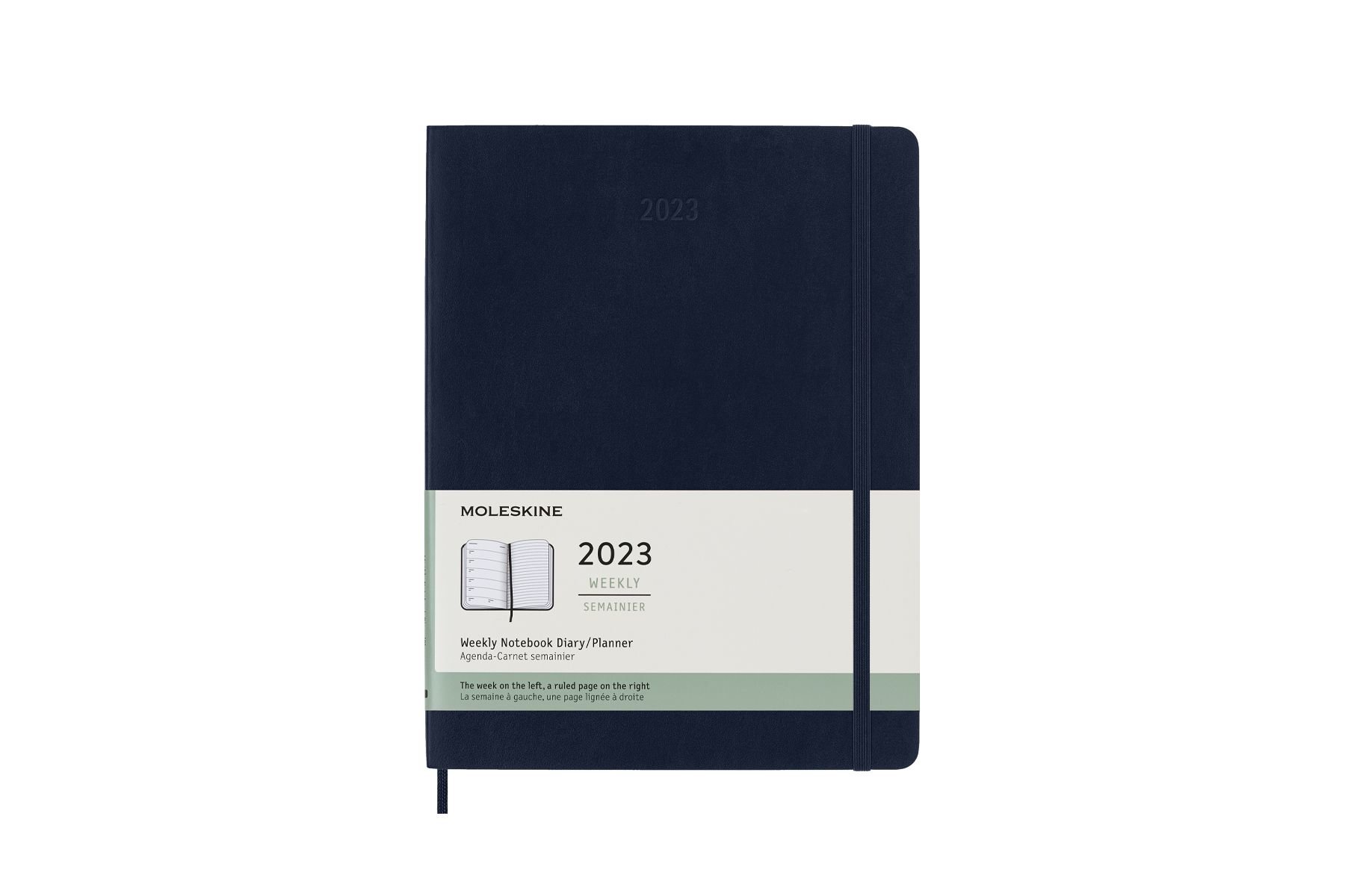 Extra velký modrý plánovací zápisník na rok 2023. Na levé straně jsou dny v týdnu a na pravé linkovaná stránka na poznámky. Zápisník má měkkou, ve hřbetu šitou vazbu. Obepíná ho pružná páska proti samovolnému otevírání. Obsahuje praktickou vnitřní kapsu, textilní záložku a 295 barevných samolepek. Papír s gramáží 70 g/m2 neobsahuje kyselin.