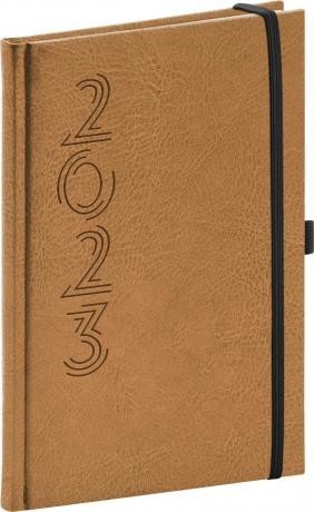 Týdenní diář Memory 2023 v béžové barvě s výrazným letopočtem v lehce abstraktním pojetí. Týdenní rozvrh v praktickém formátu A5 s česko-slovenským kalendáriem a doplňkovou angličtinou, němčinou, maďarštinou a ruštinou.