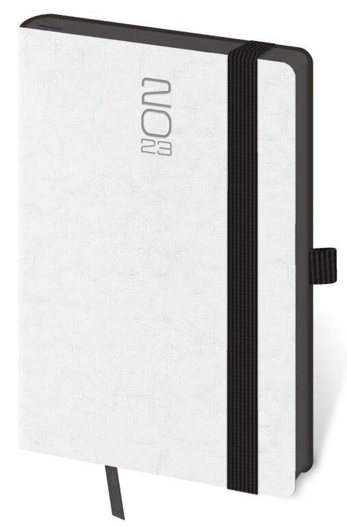 K nerozeznání od skutečné kůže, navíc doplněn gumičkou přes hřbet a ořízkou bloku ve stejné barvě. Dalšími doplňky je papírová kapsa na vnitřní straně zadních desek a poutko na tužku. Diář obsahuje: osobní údaje, plánovač dovolené (měsíční přehled), plánovací kalendář, mezinárodní svátky,...