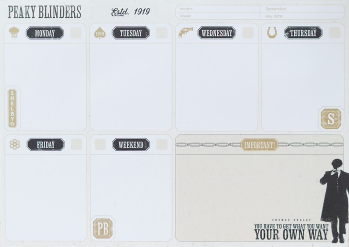 Oficiální stolní plánovač z katalogu kancelářských a dárkových produktů s grafikou, fotografiemi a licencí populárního britského historického krimi seriálu, volně inspirovaného skutečným pouličním gangem z Birminghamu Peaky Blinders. Zboží je legálně licencováno a prodáváno se souhlasem vlastníků...