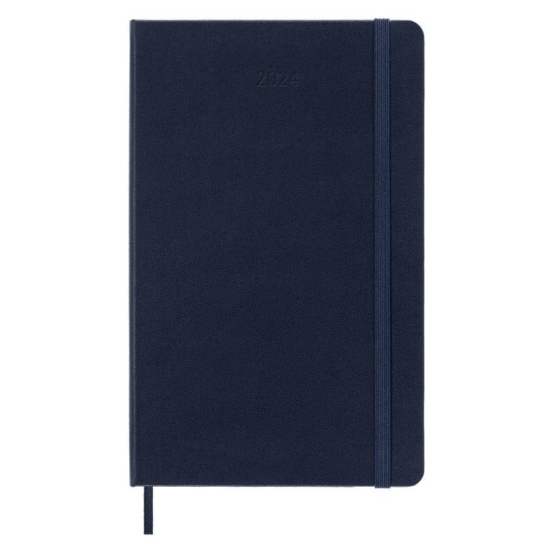 Klasický velký modrý denní diář na rok 2024. Na každý den stránka pro poznámky a schůzky. Diář má pevnou, ve hřbetu šitou vazbu v kartonových deskách. Obepíná ho pružná páska proti samovolnému otevírání. Obsahuje praktickou vnitřní kapsu na vizitky a dokumenty, textilní záložku, 3 sady samolepek a 1 sadu samolepek s letopočty. Papír s gramáží 70 g/m2neobsahuje kyseliny.