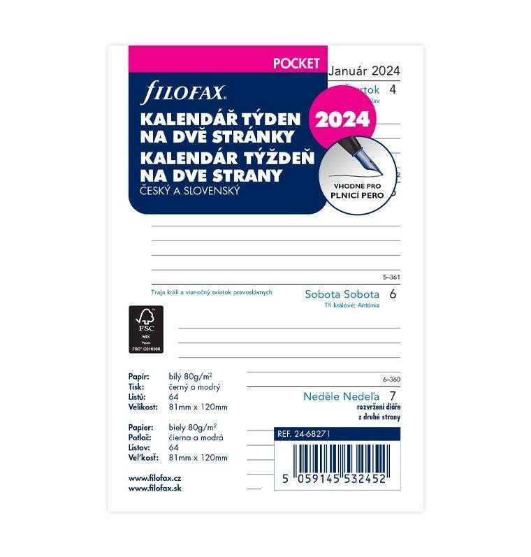 Filofax Náplň do diáře 2024 - kapesní, týden/2 str, linky, ČJ+SJ (česky)