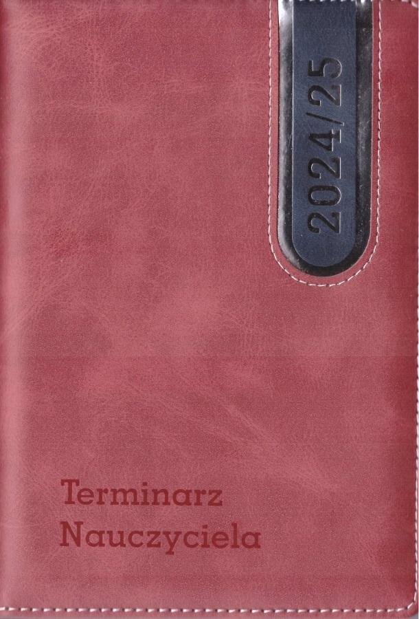 OKŁADKA: Thermo PU skóropodobna z obszyciem, gąbką 3mm, złoceniem lub srebrzeniem roku 2023/24 i napis "Terminarz Nauczyciela"BLOK - 140x205 mm, 360 str., papier biały 64g/m2, druk 2 kolory, tasiemka, kolorowa mapa Polski oraz Europy na wyklejkach, blok kalendarza szyty nićmi, kapitałka,...