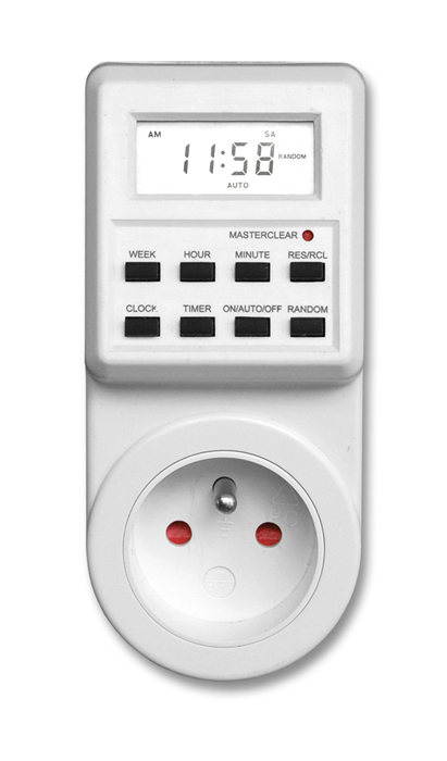 Digitální časový spínačDigitální časový spínač bílé barvy, který lze naprogramovat na celý týden (libovolně 7x24 hodin) s přesností na 1 minutu. Můžete jej využít například na vánoční stromeček, lampičku nebo jiný spotřebič, který potřebujete cíleně zapínat v určitou hodinu či minutu. Výrobek je určen pro vnitřní použití, disponuje dětskými clonkami a krytím IP20.