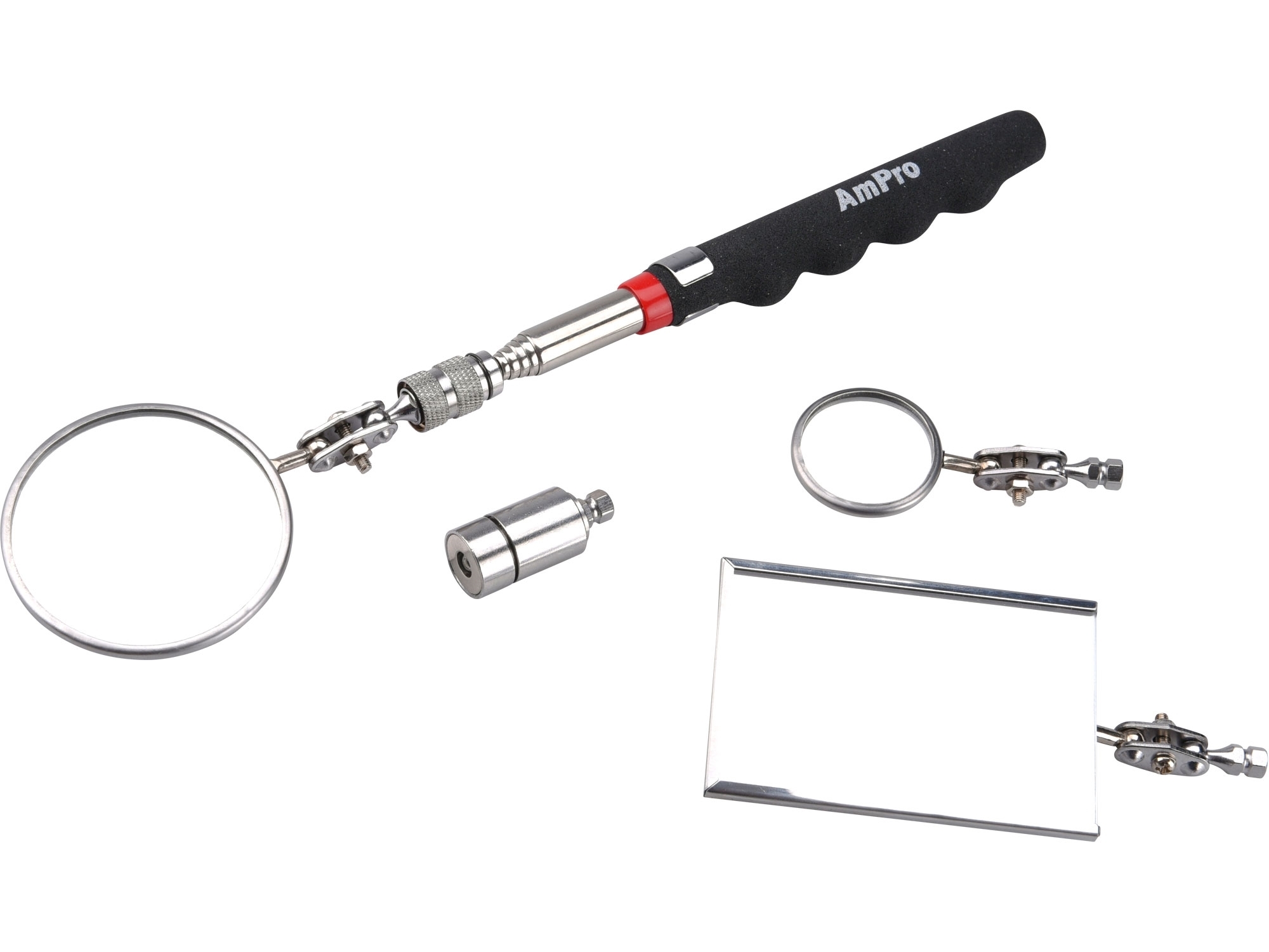 teleskopická rukojeť je zakončena 1/4" uzamykatelným vnitřním šestihranem a všechny nástavce tak mohou být s rukojetí pevně spojeny bez rizika jejich vypadnutí všechna zrcadla jsou opatřena kloubním spojením a jsou tak nastavitelná ve všech třech rovinách (3D)nosnost magnetu až 2kg