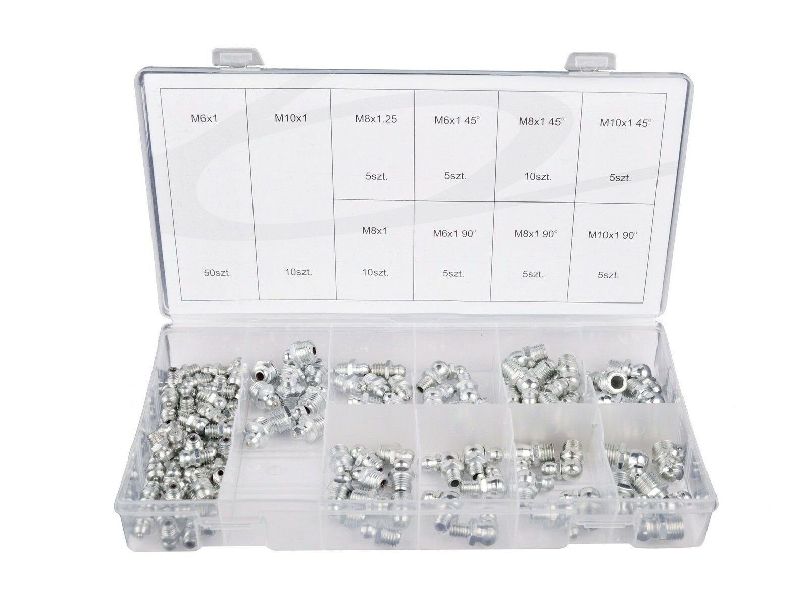 Sada chromovaných maznic, různé velikosti, 110 kusůPopis:Ideální pro použití s ručním a hydraulickým mazacím lisem / věží.Vlastnosti produktu:popruhy ve velikostech M6 - M10: rovné, 45 ° a 90 °110ks v saděplastová krabička s praktickými přihrádkamiObsah soupravy:50 kusů - M6 x 1,0010 kusů - M8 x...