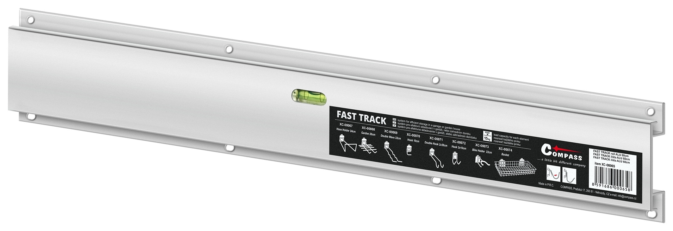 Závěsný systém FAST TRACK lišta ALU 60cm s vodováhou COMPASS Praktický závěsný systém FAST TRACK je vhodný pro uspořádání a dlouhodobé uskladnění nejen zahradního nářadí, hadic, lopat a dalšího nářadí.Systém je tvořen hliníkovou lyžinou 60 x 9 cm vhodnou k připevnění na...