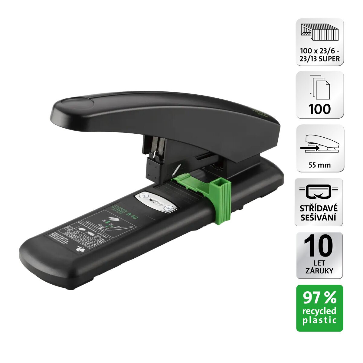 Bloková, ekologicky udržitelná a odolná sešívačka s dlouhou životností a velkým výkonem sešívání až 100 listů. Robustní kovové provedení s pláštěm z recyklovaného plastu. Antiblokovací systém (ABS) pro komfortní, bezporuchové sešívání. Variabilní hloubka vkládání až do 55 mm vkládání, horní plnění. Dvojité vedení sponek pro rychlé a přesné bypassového sešívání.