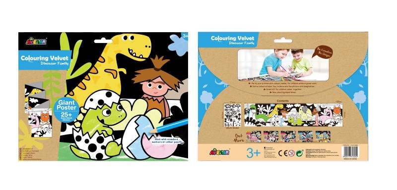 Avenir Zamatové omaľovanky MAXI - Dinosaury sú nielen skvelou zábavou pre deti od 3 rokov, ale aj tvorivým spôsobom, ako rozvíjať ich predstavivosť a motoriku. Vďaka veľkému rozmeru 126 cm x 29,5 cm si do nich môžu pustiť sami alebo s kamarátmi a vytvoriť farebné majstrovské dielo plné obľúbených dinosaurov.