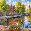 Romantický motiv: Nádherná ilustrace Amsterdamu s typickými barevnými tulipány vás přenese přímo do srdce Holandska.
