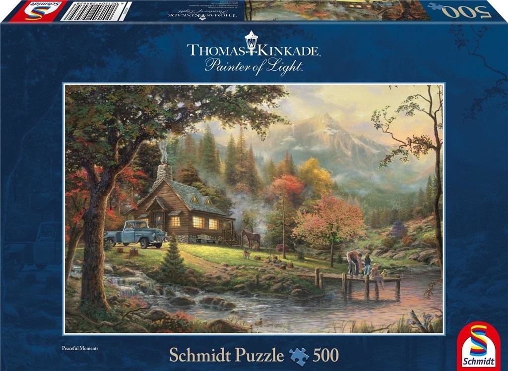 Puzzle 500 elementów autorstwa Thomasa Kinkade - Idylla nad jezioremIdealne miejsce do wypoczynku, mały domek z kominkiem, łąka prowadząca do jeziora i pomost. W tle malownicze szczyty gór oświetlone słońcem. Już sam opis sprawia, że każdy chciałby się tam przenieść i wypocząć. Umożliwiają to...