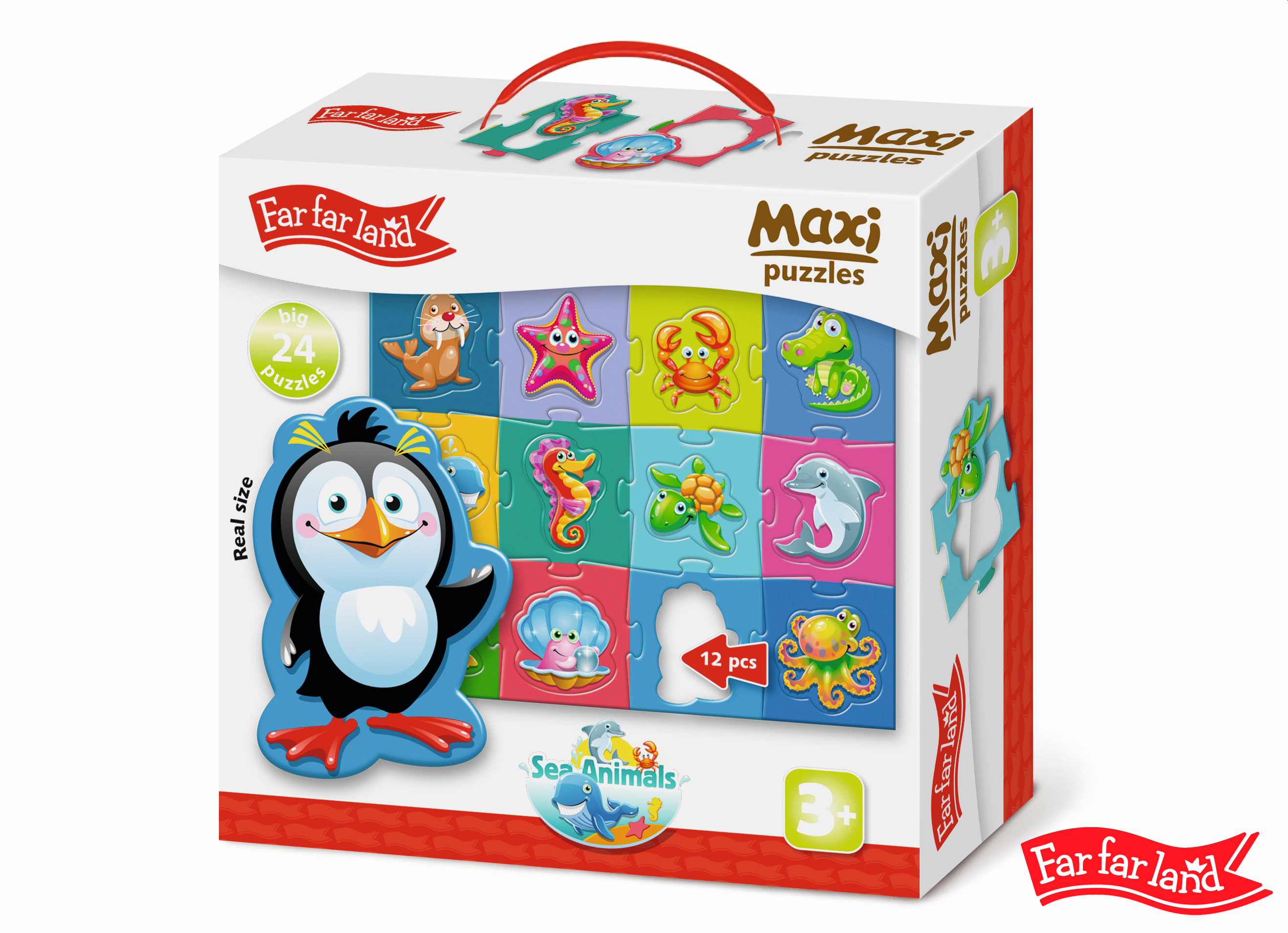 Far Far Land Maxi Puzzle mořská zvířátka. Balení obsahuje 24 dílků (12 puzzle dílků + 12 dílků se zvířátky). Složené 61x47 cm. prečítať celé