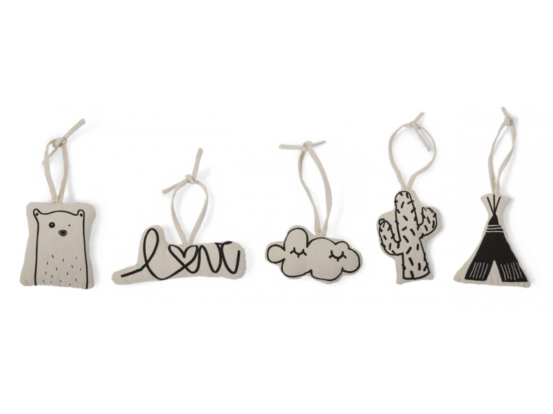 Sada pěti textilních hraček se šňůrkami k zavěšení na dřevěnou Chilhome hrazdu Tipi. Kaktus a mráček při zmáčknutí šustí, ostatní hračky chrastí. Hračky jsou vyrobené z bavlněného plátna, výplň tvoří 100% polyester.  Vhodné pro děti od narození. prečítať celé