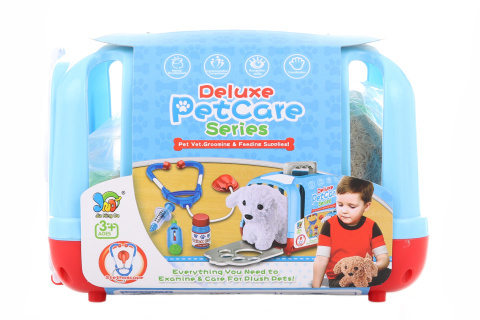 Malý veterinář s hnědým pejsek. Balení obshauje plyšového psa, kartáč, holící strojek a přepravku na přenášení. Rozměr balení cca 18,5 x 13 x 13,5 cm. Věk 3+ prečítať celé