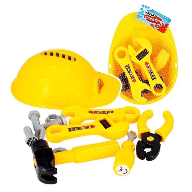 Sada obsahuje: přilbu, kladivo, plochý klíč, klíč, kleště, šroubovák, 3x šroub + čepici. Vše je vyrobeno z plastu. Rozměry balení [cm]: 8x14x3