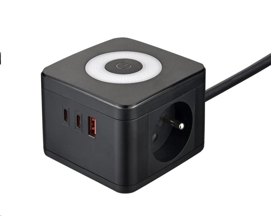 Viking síťový adaptér YC23L, 2x 230 V, 1x USB-A, 2x USB-C, dotykové světlo, délka 1,4 m, černá