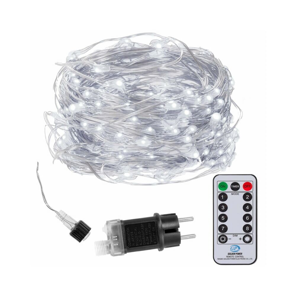 Ultratenký světelný řetěz s programátorem, 8 světelnými funkcemi a dálkovým ovladačem. Adaptér na bezpečné napětí, ultra úsporné nano led diody, neviditelný kabel. Vnitřní i venkovní použití, voděodolné provedení, krytí IP44. Délka světelné části 30 m, napájecí kabel 3 m. Barva studená bílá, 300 led.