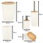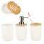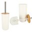 Sada bílých koupelnových doplňků - mýdlenka, nádobka na mýdlo, držák na zubní kartáček, kelímek, kartáček s nádobkou, odpadkový koš. Všechny kusy jsou ve stejném stylu - hodí se do každé koupelny. Materiál: plast + dřevo.Elegantní černá sada koupelnových doplňků s dřevěnými akcenty pro styl a...
