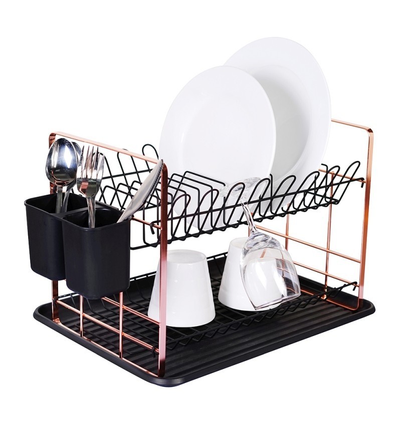 prakticky vybavený odkapávač na nádobí z kolekce Black Rose Collectionvyrobený v kombinaci chromované oceli a PP plastucelkem 2 patra pro odkládání umytého nádobí, horní s profilací na talíře a spodní rovnýna straně dvě přihrádky na příbory a kuchyňské náčinídůležitou součástí je odkapávací tác...