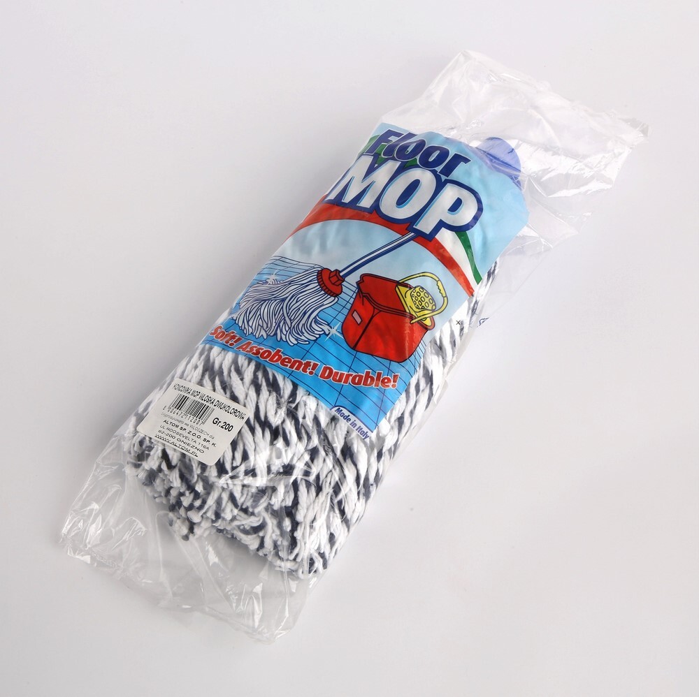 Końcówka mop w kolorze biło-niebieskim o gramaturze 200, została wykonana z bawełny. Pozwala na mycie podłogi bez posostawiania smug i zacieków, nie pozostawia również zadrapań. Końcówka mop posida gwint pasujący do większości kiji. Skręcone sznurki zwiększają efektywnośc mycia powierzchni. Elemnty plastikowe przy mopie są wytrzymałe i estetyczne.