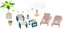 W zestawie mebli outdoorowych do zabawy dla dzieci znajdziemy: 2 leżaki, 2 krzesła i stolik ogrodowy, parasol przeciwsłoneczny, drzewko w doniczce.