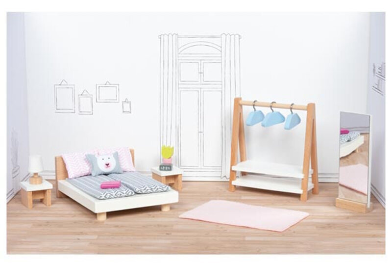 Zestaw drewnianych, nowoczesnych mebli dla lalek "Stylowa sypialnia" to kolejna propozycja dodatku do domku dla lalek marki Goki. Ten składający się z 18 elementów zestaw charakteryzuje się dużą solidnością oraz precyzją wykonania. Lalki twojego dziecka otrzymają do dyspozycji m.in. łoże...