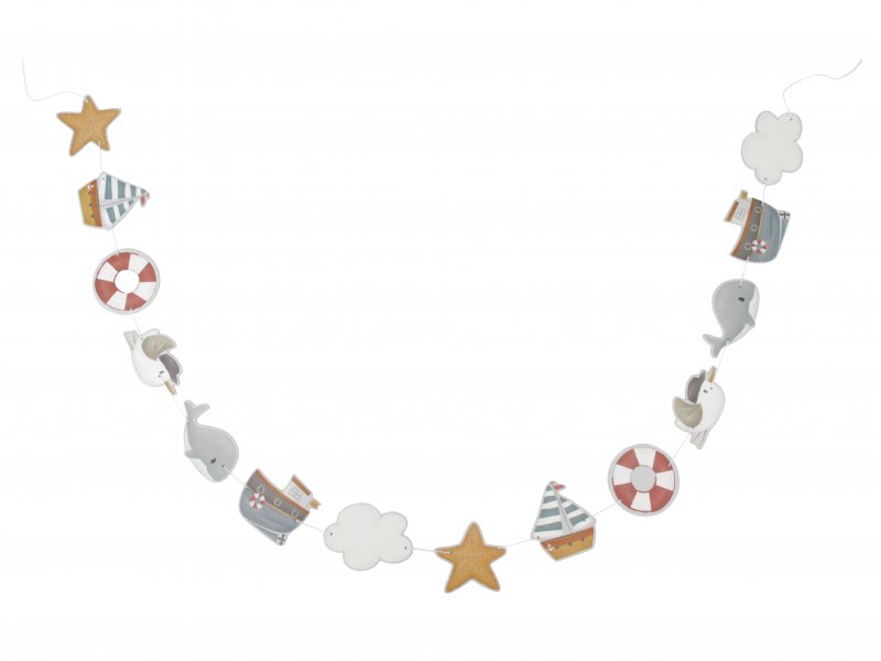 Dekorativní girlanda s krásnými motivy kolekce Námořnický záliv se stane originální ozdobou dětského pokoje. Plachetnice, rackové, velryby a další motivy ze života na moři pomohou rozvíjet fantazii vašeho dítěte, když mu před spaním budete vyprávět příběhy o životě na moři.