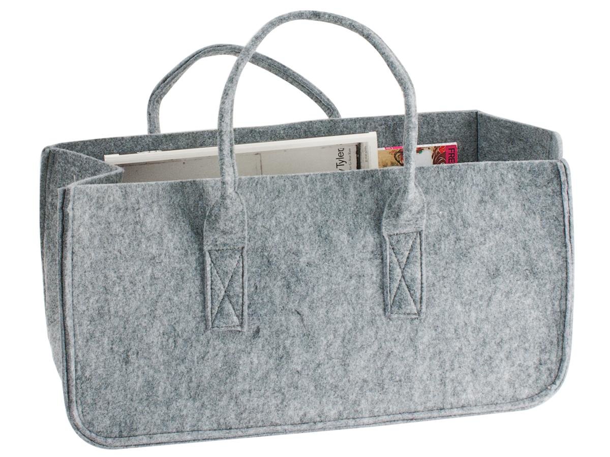 Stojan/taška na noviny a časopisy v decentní šedé barvě.
