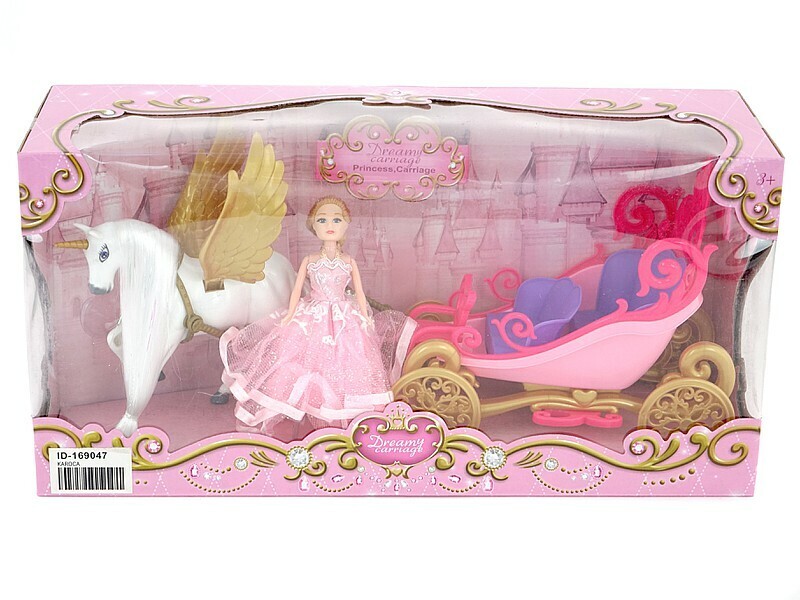 Kareta w zaprzęgu z jednorożcem i lalką. Karoca posiada efekty dźwiękowe i świetlne. Koń ma długą grzywę oraz ruchome elementy(skrzydła). Księżniczka w balowej sukni w kolorze różowym dołączono akcesoria do czesania.Zestaw zasilany bateriami: 3x1,5V AG13(w zestawie).Wymiar opakowania: 38x14x22cm.Wiek: 3+