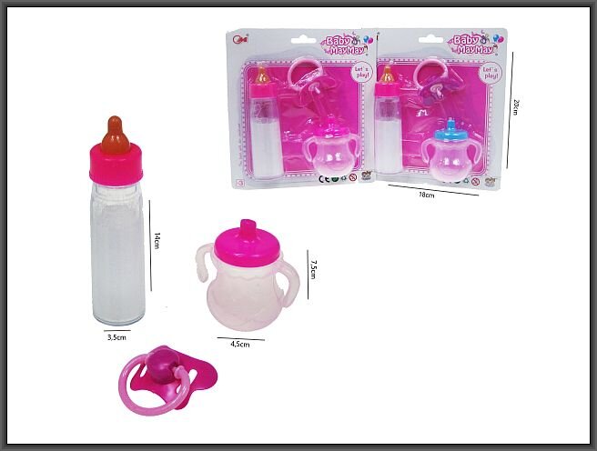 Butelka 13cm ast. z mlekiem lub z sokiem , butelka 7cm oraz smoczek 5cm B/C 12/72