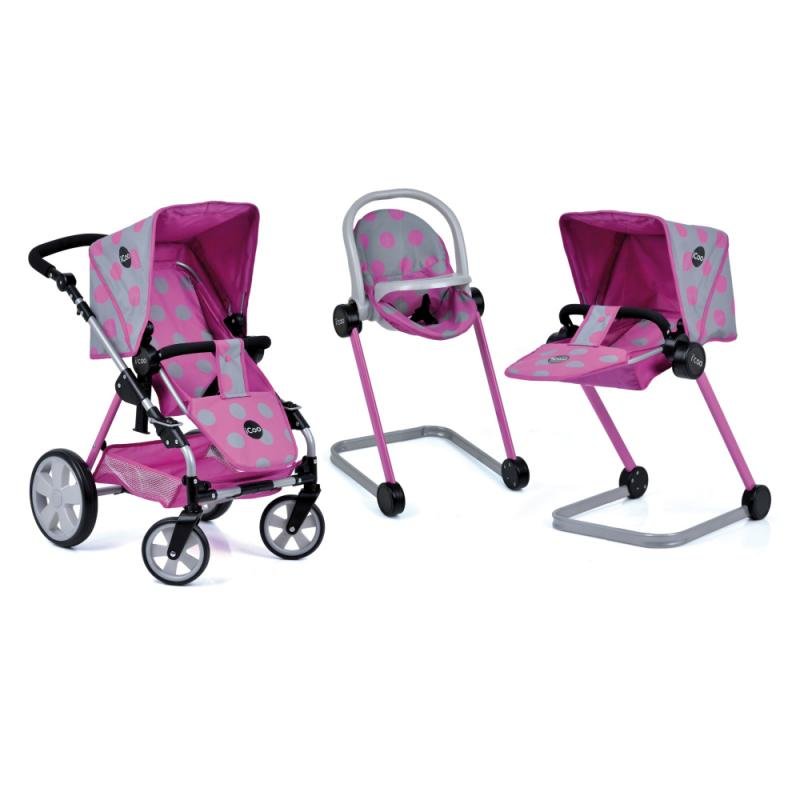Kombinace kočárku, sportovního kočárku a autosedačky s polohovací rukojetí pro panenky do velikosti 43cm. Rozměry kočárku 63x38x65cm, šířka sedáku kočárku 20cm a sedačky do auta 17cm. Výška madla je nastavitelná od výšky 40-66cm. Vnitřek kořárku je polohovatelný. Průměr koleček předních 12,5cm, zadních 20cm. Ve spod kočárku je košík na drobnosti a stříška. Doporučený věk 3+