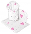 Sada obsahuje zavinovačku, perinku a malý vankúšik, ktoré sú vyrobené z kvalitných materiálov s certifikáciou pre detské výrobky. Vnútorna strana zavinovačky je z príjemnej 100% bavlny, zatiaľ čo vonkajšia strana je z jemného polyesteru Minky, ktorý je známy svojou hebkosťou a teplom. Výplň je rovnako z 100% polyesteru, čo zabezpečuje pohodlie a tvarovú stálosť počas hry.