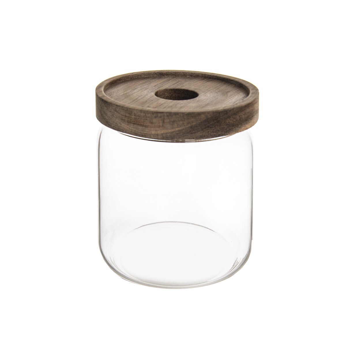 Dóza s víčkem s těsněním na uskladnění potravin. Zachová aroma i chuť vložených potravin, potraviny nezvlhnou. Materiál: borosilikátové sklo, akáciové dřevo, silikon – těsnění. Rozměry: objem 0,73 l, pr. 10 cm, v. 12 cm. Do myčky je vhodná pouze skleněná část, není vhodná do MVT.