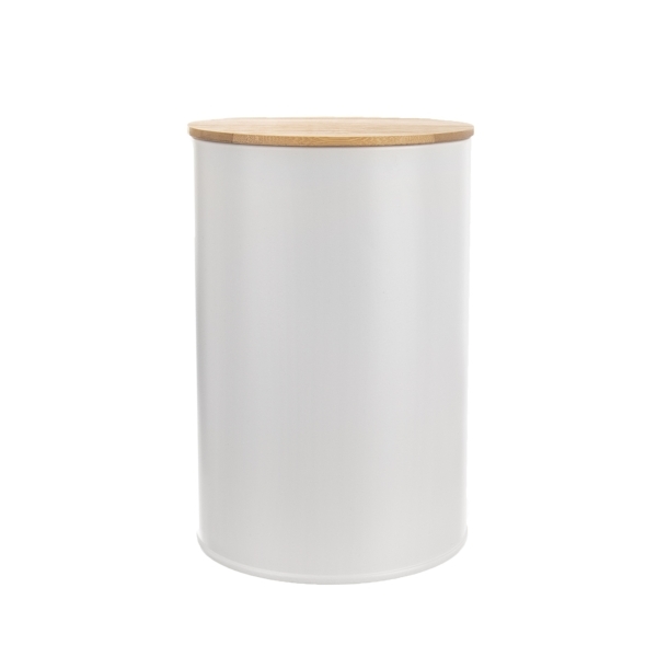 Dóza s víčkem na uložení čaje, kávy... Materiál: plech, bambus, silikon - těsnění. Rozměry: o. 0,8 l, pr. 9,5 cm, v. 12,5 cm. prečítať celé