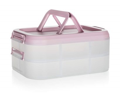 Party box s rozmermi 40 x 28 cm ponúka dve priestranné a priehľadné vrstvy s držadlami, vďaka ktorým je manipulácia jednoduchá a pohodlná. Ružové viečko pridáva svieži farebný prvok, ktorý upúta pozornosť na každej spoločenskej udalosti.