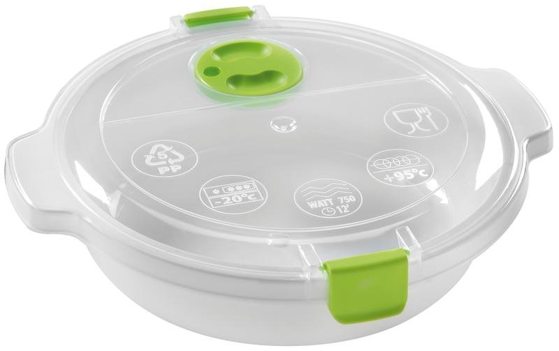 Plastová dóza s transparentním víkem je vynikající pro rychlé rozmrazování, ohřívání i vaření v mikrovlnné troubě. Hotové pokrmy pak můžete v dóze uchovávat v ledničce nebo zmrazit. Na víku má dóza otočný uzávěr pro odvod páry. Objem 0,7 l, barevné provedení - zelená, modrá, taupe.